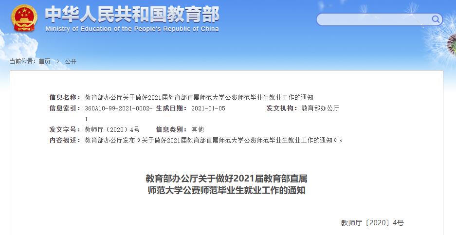 教育部辦公廳關于做好2021屆教育部直屬師范大學公費師范畢業生就業工作的通知