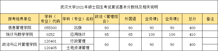 在《武漢大學2021年碩士招生考試復試基本分數線及相關說明》中可以看到,今年其出版、行政管理、土地資源管理復試線均為400分,應用統計高達410分!
