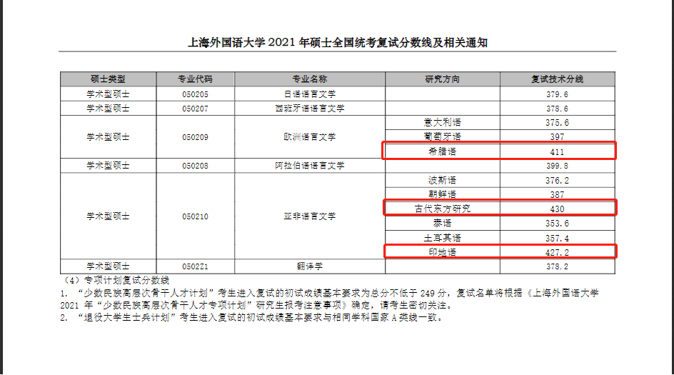 在《上海外國語大學2021年碩士全國統考復試分數線相關通知》中可以看到,今年其學術型碩士歐洲語言文學(希臘語)411分、亞非語言文學的古代東方研究430分、印地語427.2分。