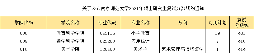 在《關于公布南京師范大學2021年碩士研究生復試分數線的通知》中可以看到,今年其教育教學學小學教育(401分)、數學科學學院-應用統計專業(400分)及美術學院-美術學專業(414分)。
