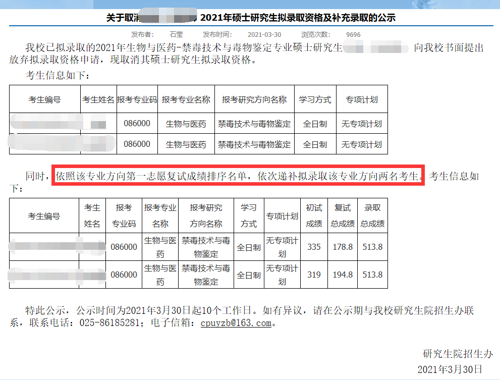因部分考生放棄及學校研究生招生計劃動態調整,根據遞補原則(1. 成績由高至低遞補 2. 復試結論為不合格者不予考慮 3. 考生未被其他學校擬錄取)現擬錄取以下同學。
