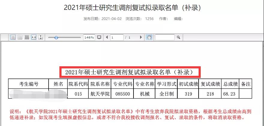 《航天學院2021年碩士研究生調劑復試擬錄取名單》中有考生放棄我院擬錄取資格,根據考生總成績由高到低遞進補錄;如發現考生填報虛假信息,或者不符合我校接收調劑報名、復試、錄取的條件,將取消錄取資格。