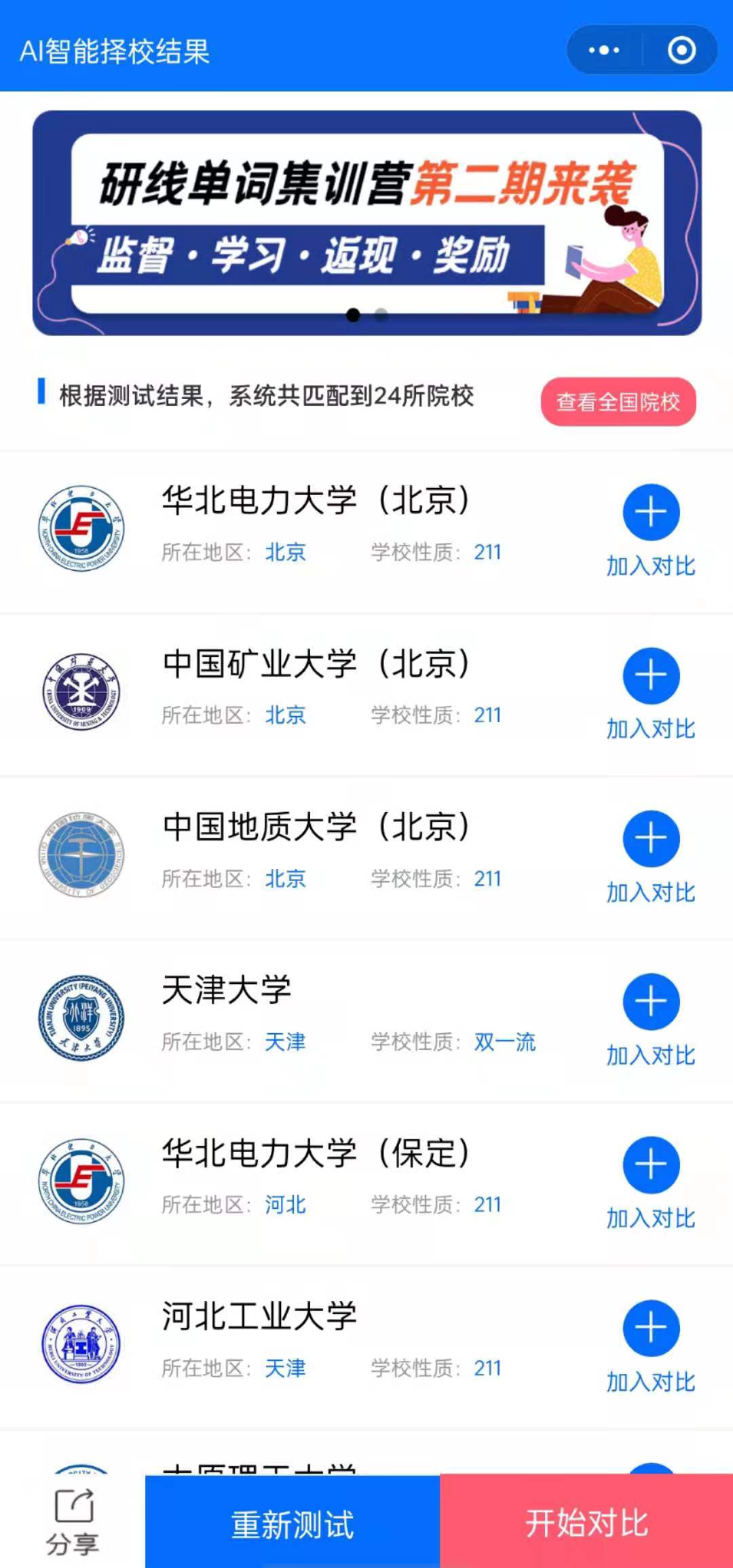 有的同學對于擇校無從下手,不清楚自己對于學校的要求,也不清楚有哪些院校可供選擇。MPAcc考研助手通過六個問題,明確你的需求并進行智能擇校,根據測試結果,系統匹配院校,可以清楚知道有哪些院校符合擇校需求,讓你擇校不再愁!