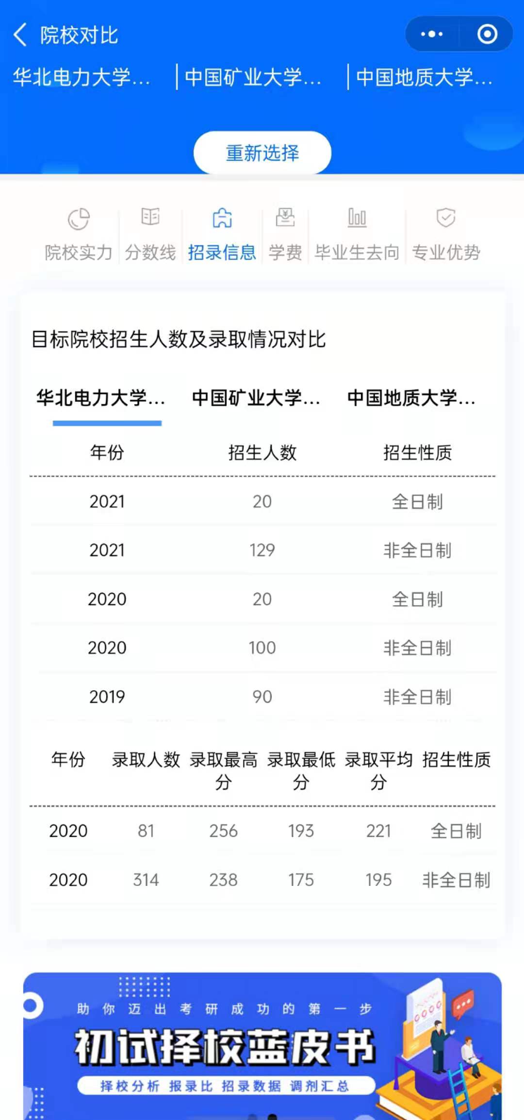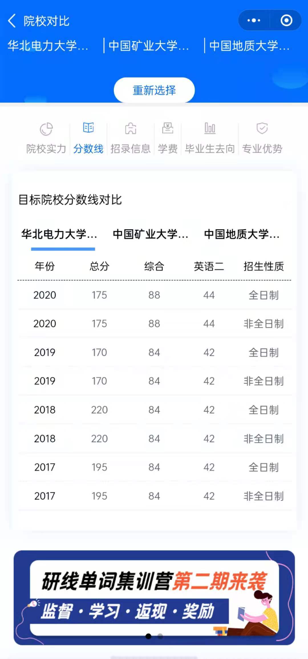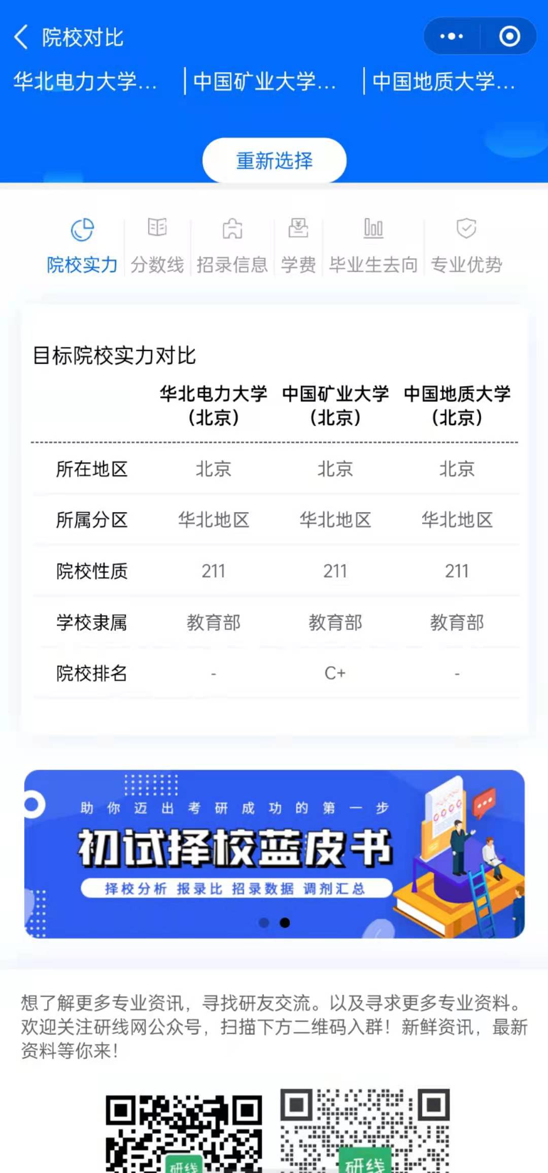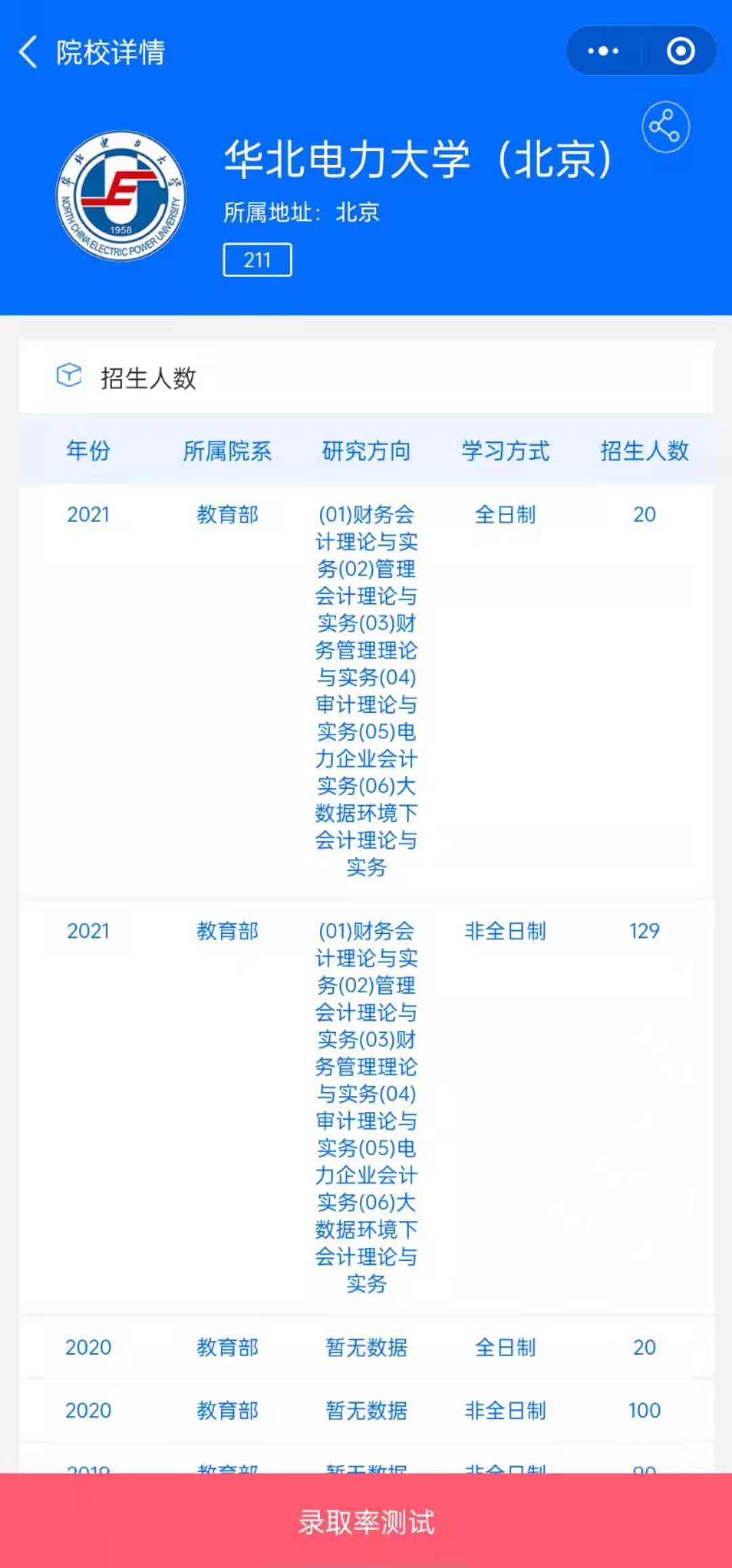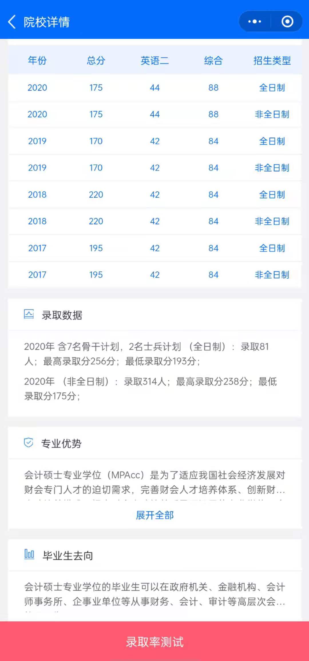 MPAcc考研助手還提供院校對比功能,將心儀院校加入對比,小程序會直觀的提供對比院校的詳細對比數據,包括:院校實力、分數線、招錄信息、學費、畢業生去向、專業優勢,幫助考生進一步精準擇校。