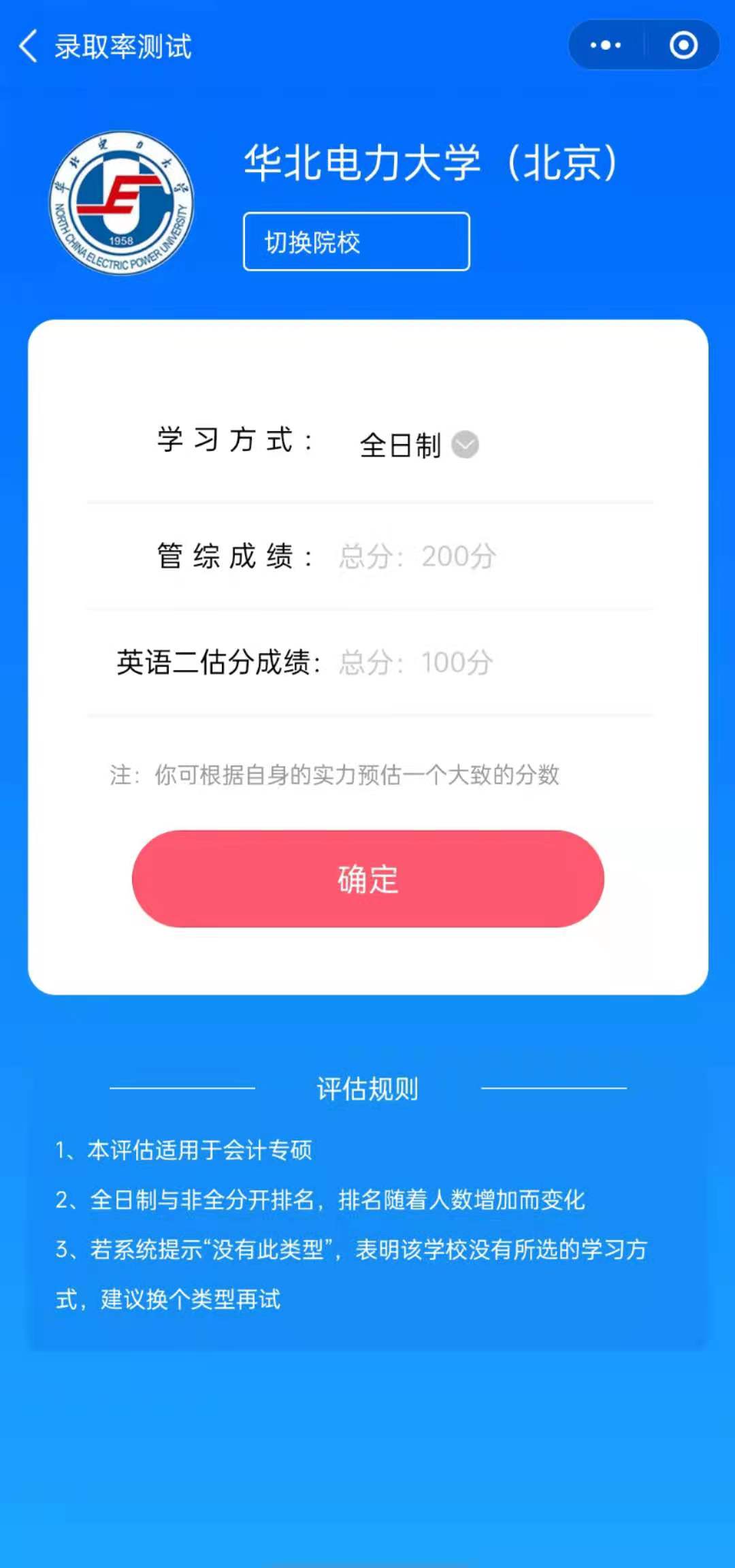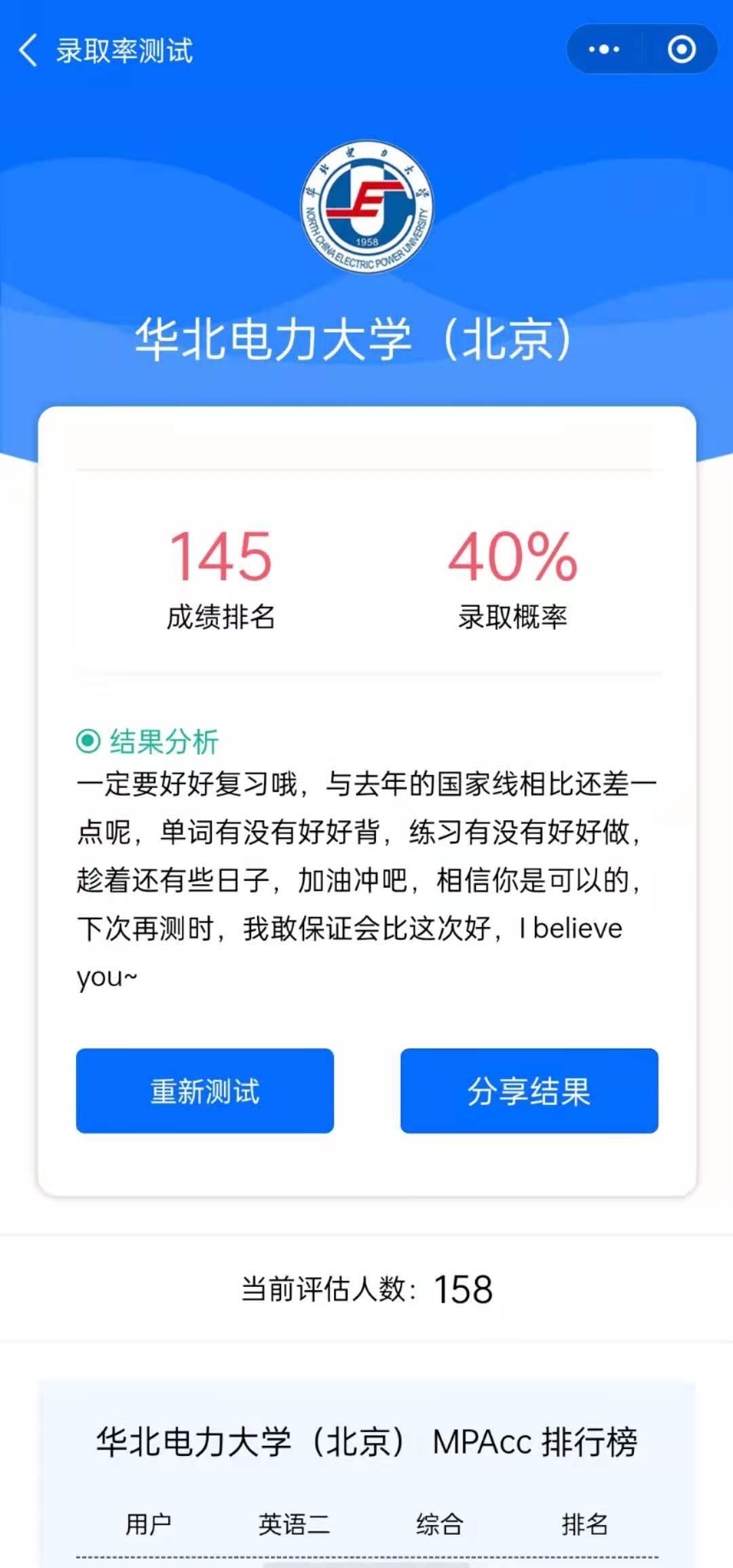 考生選好心儀的院校后,可以根據自己的復習情況輸入預估的管綜成績、英語成績進行錄取率測試。測試結果中提供成績排名、錄取概率以及結果分析,還可以根據其他用戶的錄取率情況查看自己的排名。