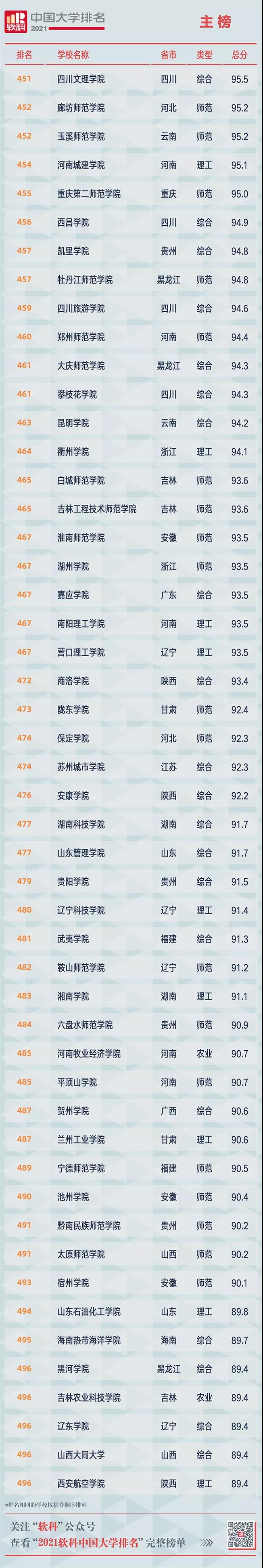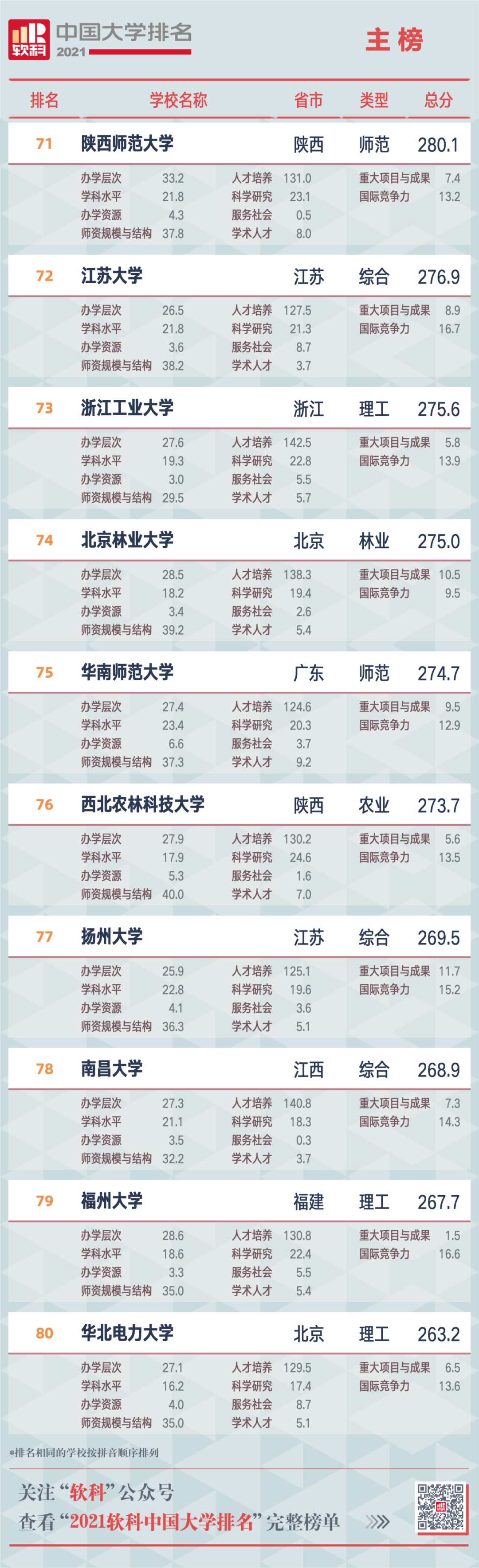 2021軟科中國大學排名(主榜)的上榜高校共有582所,清華大學、北京大學、浙江大學占據前三,上海交通大學、南京大學位列全國前五。其他位列全國前十名的大學依次為復旦大學(第六)、中國科學技術大學(第七)、華中科技大學(第八)、武漢大學(第九)、西安交通大學(第十)。西安交通大學相較2020年排名上升1名,首次入圍全國十強。西安交通大學堅持“扎根西部、服務國家、世界一流”的辦學定位,建設世界一流研究型大學的愿景已現曙光。