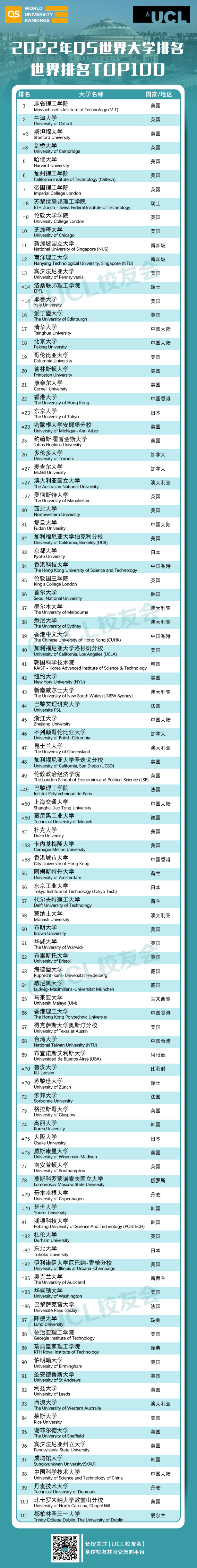 這也是UCL時隔一年,重回世界第八名的位置(文末附2022年QS世界大學排名Top 100大學)。