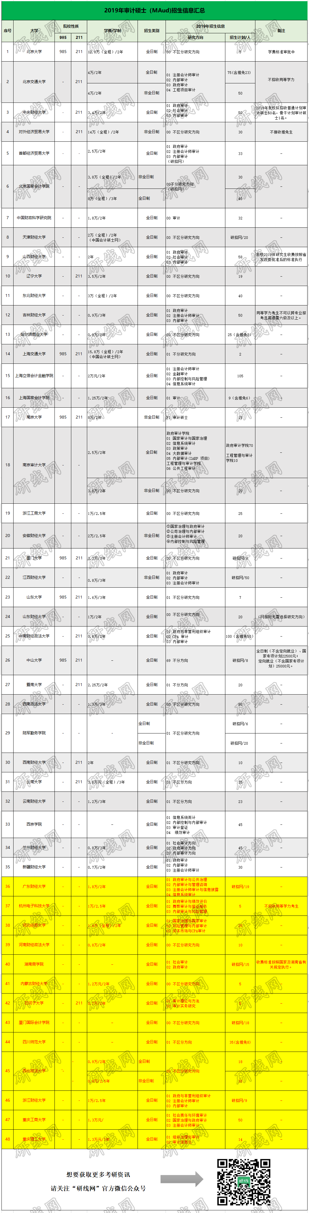 以上就是研線網整理的"2019年審計碩士(MAud)招生信息匯總",本文信息匯總于2018年10月13日,如有更新,請以院校最新為準,預祝大家考研成功。