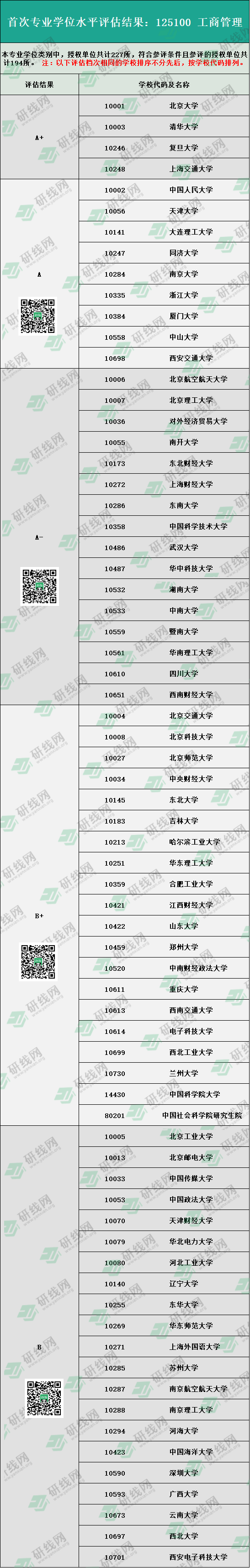 “125100 工商管理”評估結果中,授權單位共計227所,符合參評條件且參評的共計194所。