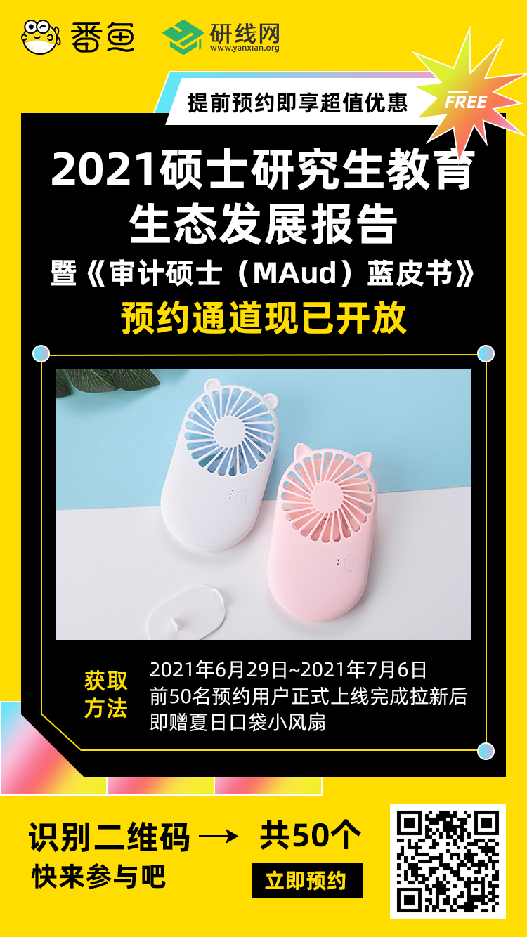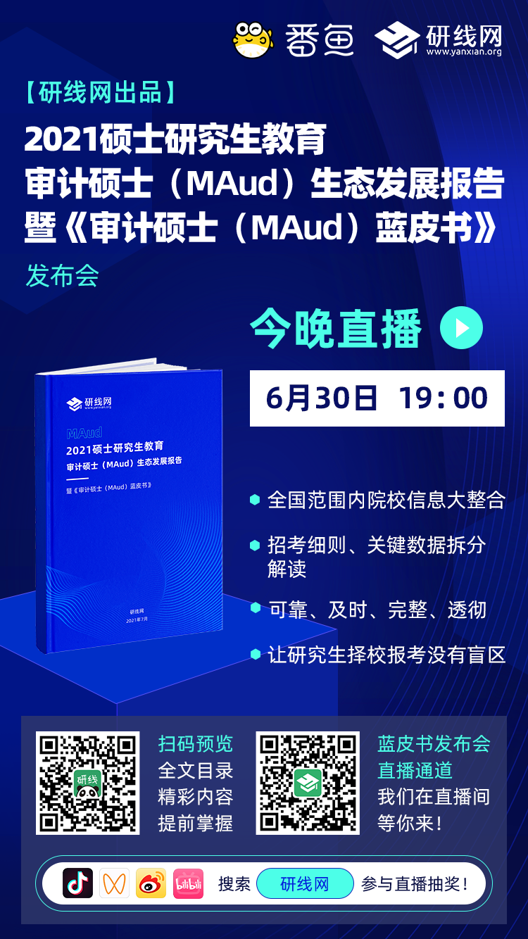 【研線網出品】2021碩士研究生教育審計碩士(MAud)生態發展報告暨《審計碩士(MAud)藍皮書》在7月7日10:00全網正式上線!在正式上線之前,我們將以直播形式為大家詳細介紹。