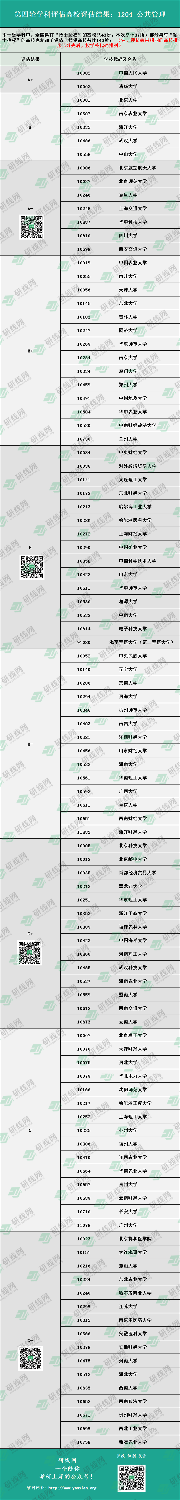 下面是全國第四輪學(xué)科評估結(jié)果 1204 公共管理 的院校排名,供大家擇校參考。(注:評估結(jié)果相同的高校排序不分先后,按學(xué)校代碼排列)
