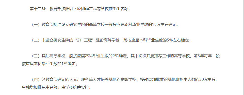 經教育部確定的人文、理科等人才培養基地的高等學校,按教育部批準的基地班招生人數的50%左右,單獨增加推免生名額,由學校統籌安排;對國家發展急需的專業適當增加推免生名額。