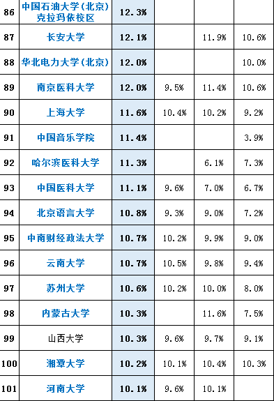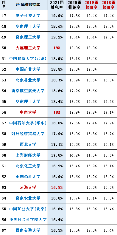 多數情況下,雙一流院校、優勢學科、基礎學科院校推免率偏高。在@博雅數據庫推免率top100院校排名表中(如下圖)可以看到,清華、北大2020年保研率均超過50%。