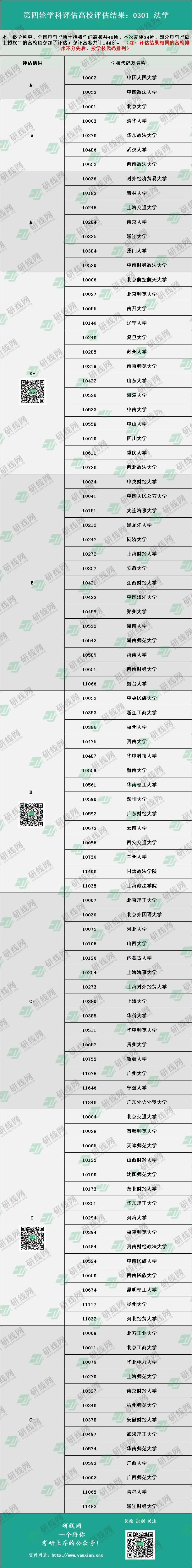 下面是全國第四輪學科評估結果 0301 法學 的院校排名,供大家擇校參考。(注:評估結果相同的高校排序不分先后,按學校代碼排列)