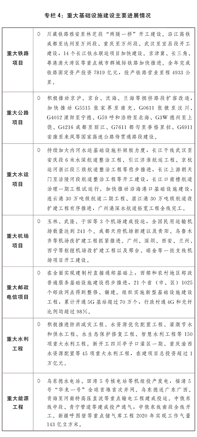 二是增強投資增長后勁。堅持“項目跟著規劃走,資金要素跟著項目走”,加快國家重大戰略項目實施步伐,加強重大項目資金、用地等要素保障。發揮中央預算內投資在外溢性強、社會效益高領域的引導和撬動作用,安排中央預算內投資6100億元,比上年增加100億元。新增地方政府專項債券規模為3.65萬億元,優先支持在建工程,合理擴大使用范圍。激發全社會投資活力,形成市場主導的投資內生增長機制。協同推進投資審批制度改革、開展投資領域專項執法檢查,著力深化在線平臺建設應用。加大新型基礎設施投資力度,謀劃布局5G、數據中心、基礎軟件、空間基礎設施等建設。支持城市防洪排澇設施建設,加強城市內澇治理。穩步推進川藏鐵路、西部陸海新通道等重大項目建設,完善機場布局,加快推進三峽樞紐水運新通道建設前期工作,實施國家水網、航道網工程,有序推進油氣和電力等重大能源工程。穩妥推進基礎設施領域不動產投資信托基金試點,推動盤活存量資產,形成投資良性循環。規范推廣政府和社會資本合作模式,吸引民間資本參與。