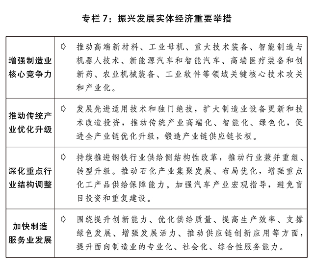 二是著力振興和發展實體經濟。實施新一輪制造業核心競爭力提升五年行動計劃,開展先進制造業集群發展專項行動,創建國家制造業高質量發展試驗區。對先進制造業企業按月全額退還增值稅增量留抵稅額,提高制造業貸款比重,擴大制造業設備更新和技術改造投資。加快重點行業結構調整和綠色化改造,持續推進國家戰略性新興產業集群發展工程,強化技術創新和公共服務。落實新時期促進集成電路產業和軟件產業高質量發展的若干政策。加強產業管理,促進新能源汽車健康有序發展,加快構建智能汽車基礎設施、產業生態等支撐體系。加快壯大新能源等產業,提升新能源消納和存儲能力。培育壯大生物經濟,推動生物技術融合發展。加快臨床急需用藥和高端醫療裝備開發及產業化。推動北斗大規模應用及產業化發展。穩步提升航空產業鏈現代化和國際化水平。繼續推動先進制造業和現代服務業融合試點。依托工業互聯網、工業軟件等新一代信息技術,加快制造服務業發展。進一步完善廢舊家電回收處理體系,暢通家電生產、消費、回收、處理全鏈條。實施中華老字號保護發展工程。辦好2021年中國品牌日活動。