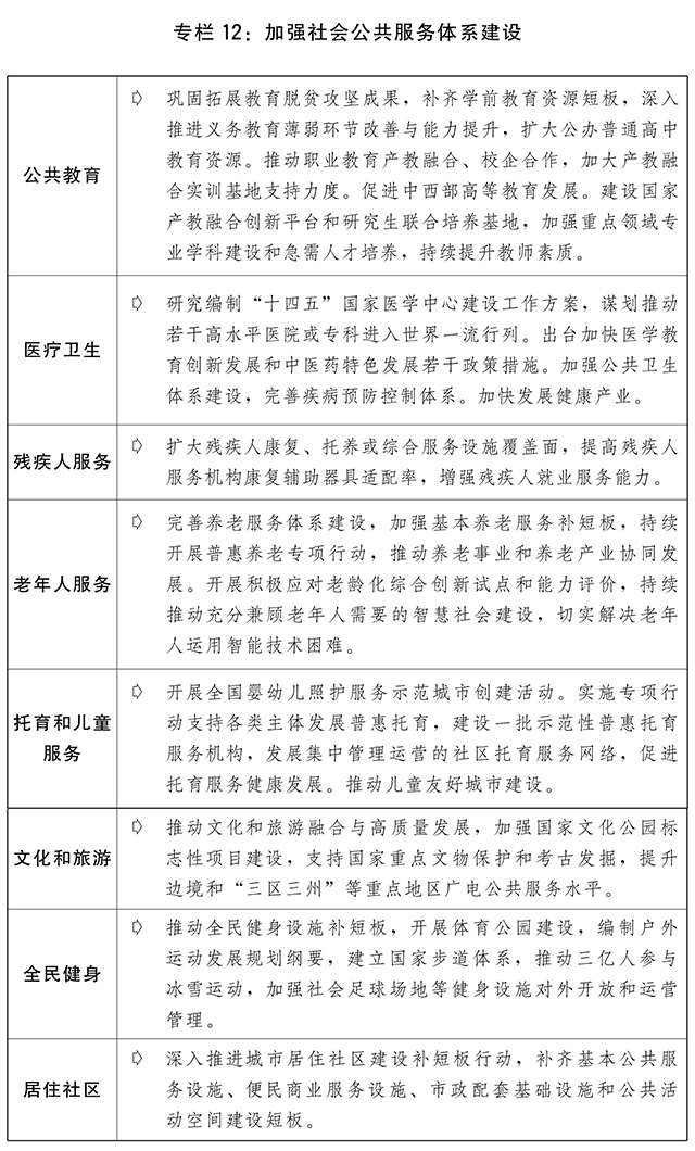 五是加強社會公共服務體系建設。推動出臺“十四五”公共服務發展規劃,完善均等化推進機制,推動國家基本公共服務標準落地落實。持續推進健康中國行動。啟動實施優質高效醫療衛生服務體系建設工程,推進疾病預防控制體系現代化,加強心理健康服務體系建設和規范化管理,發展全方位全生命周期健康服務。推進國家醫學中心建設,深入推進區域醫療中心建設試點,加快優質醫療資源擴容和均衡布局。啟動實施醫療保障服務示范工程,推動醫療保障公共服務標準化、規范化、精細化。建立健全農村醫療衛生服務網絡和城市社區衛生服務網絡,提高醫療保障水平。堅持中西醫并重,實施中醫藥振興發展重大工程。實施積極應對人口老齡化國家戰略,增強生育政策包容性,著力降低生育、養育、教育成本。發展普惠型養老服務和互助性養老,構建居家社區機構相協調、醫養康養相結合的養老服務體系,健全養老服務綜合監管制度,加快推進養老產業發展,統籌推進農村養老服務發展。發展普惠托育服務體系。深化家政服務業“領跑者”行動,培育員工制家政企業,推動家政進社區。推進長城、大運河、長征、黃河等國家文化公園建設,著力打造中華文化重要標志。實施文化保護傳承利用工程,加強重要文化遺產和國家公園等重要自然遺產保護利用,推進故宮博物院北院區、國家美術館等重大文化設施項目建設。繁榮發展哲學社會科學。促進文化和旅游融合發展,培育世界級旅游景區和度假區、國家級休閑城市和街區。出臺實施國民休閑綱要(2021-2035年),推動落實帶薪休假制度。深入推進北京冬奧會、冬殘奧會籌辦工作。制定構建更高水平的全民健身服務體系的意見,打造貼近自然、便捷高效的群眾健身場地。開展社會服務設施兜底線工程,支持兒童福利設施、殘疾人康復和托養設施建設,進一步補上退役軍人等領域基礎設施短板,提升兜底保障能力。加強和創新社會治理,健全城鄉社區治理和服務體系。深化公共法律服務體系建設。完善和落實安全生產責任制,加強安全生產監管執法。強化生物安全保護,加強國家生物數據中心體系和高級別生物安全實驗室建設,提高食品藥品安全保障水平,加強網絡食品安全監督管理,啟動建設食品安全風險評估與標準研制重點實驗室。加強應急救援力量建設,提高防災減災抗災救災能力,切實做好洪澇干旱、森林草原火災、地質災害、地震等防御和氣象服務。