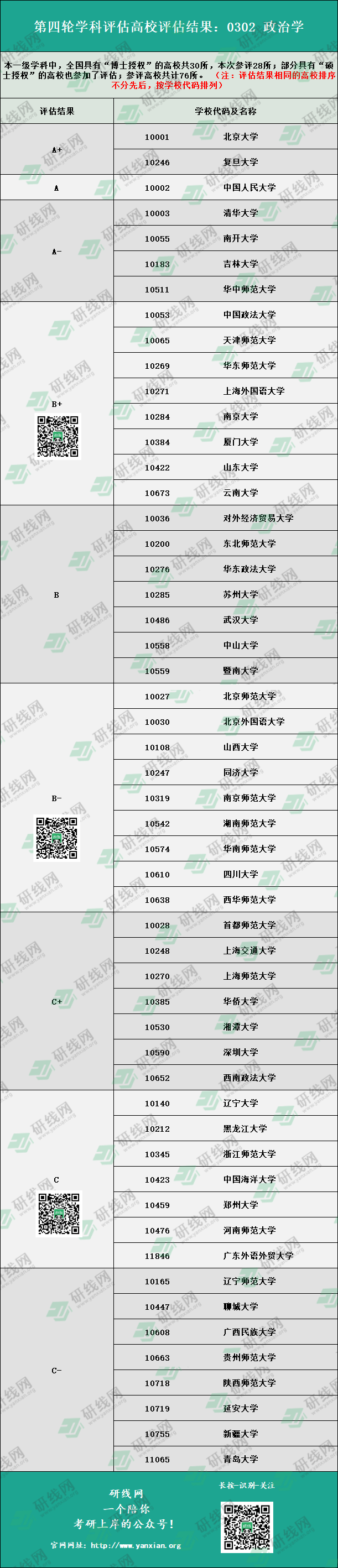 下面是全國(guó)第四輪學(xué)科評(píng)估結(jié)果 0302 政治學(xué) 的院校排名,供大家擇校參考。(注:評(píng)估結(jié)果相同的高校排序不分先后,按學(xué)校代碼排列)