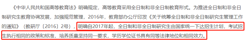 教育部辦公廳早在去年發(fā)布了《關(guān)于進(jìn)一步做好非全日制研究生就業(yè)工作的通知》,明確自2017年起,全日制和非全日制研究生由國(guó)家統(tǒng)一下達(dá)招生計(jì)劃,考生招生執(zhí)行相同的政策和標(biāo)準(zhǔn),培養(yǎng)質(zhì)量堅(jiān)持統(tǒng)一要求,學(xué)歷學(xué)位證書具有同等法律地位和效力。