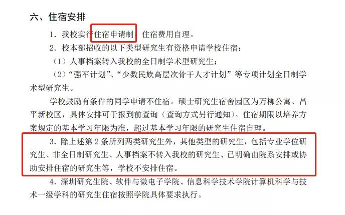 北京大學實行住宿申請制,專業學位研究生(專碩)、非全日制研究生、人事檔案不轉入北京大學的研究生、已明確由院系安排住宿的研究生等,北京大學不安排住宿。