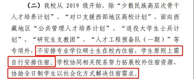 復旦大學從2019級開始,除“少數民族高層次骨干人才培養計劃”、“對口支援西部地區高校計劃”、面向西藏地區“公共管理人才培養計劃”、“退役大學生士兵計劃”、“研究生支教團”、“人才工程預備隊(一期)”等專項外,不安排專業學位碩士生在校內住宿,學生原則上需自行安排住宿。