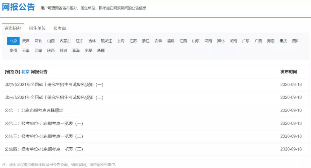 考生需要注意的是,每一年的預報名開始前,各省市招辦、招生單位、報考點就開始在網報公告版塊陸續更新公告,提醒考生相應的注意事項。請及時關注。