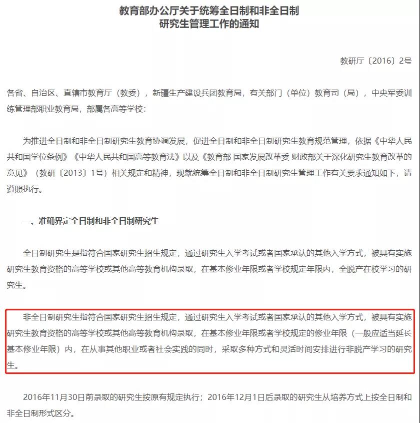 非全日制的教育起步晚于全日制,是由以前的“在職研究生”演變而來。2016年9月,教育部發(fā)布《關(guān)于統(tǒng)籌全日制和非全日制研究生管理工作的通知》,首次準(zhǔn)確界定了全日制研究生和非全日制研究生,主要在學(xué)習(xí)時間安排、全脫產(chǎn)和非脫產(chǎn)上有所不同。2016年12月1日后錄取的研究生從培養(yǎng)方式上按全日制和非全日制形式區(qū)分,從此“非全”正式走上了研究生教育的舞臺。