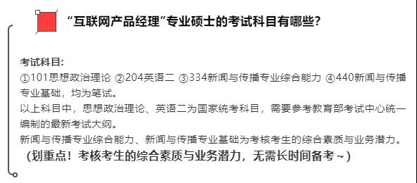 2020年,某知名高校發(fā)布了《2021“互聯(lián)網(wǎng)產(chǎn)品經(jīng)理”非全日制專業(yè)碩士報名》的公告,在相關(guān)“考試科目”介紹中可以發(fā)現(xiàn)除了規(guī)定的國家統(tǒng)考科目外,其余兩門有專業(yè)代號、新聞傳播類專碩考研必考的科目并不在重點考察范圍內(nèi),官方也標(biāo)注了“無需長時間備考”。