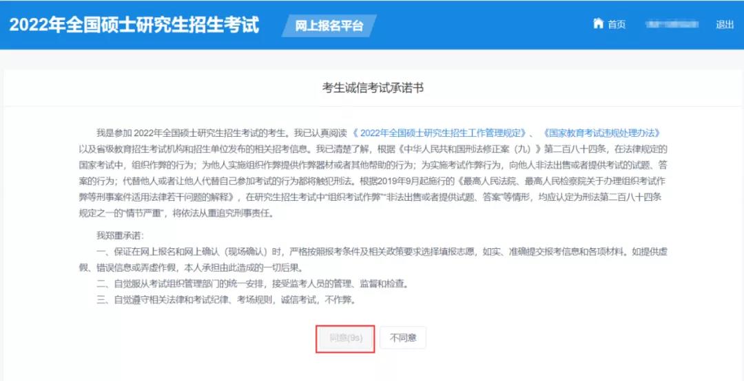 閱讀頁面上出現的《網上報名公告》后,點擊“閱讀完畢”,繼續閱讀《考生誠信考試承諾書》,點擊“同意”。