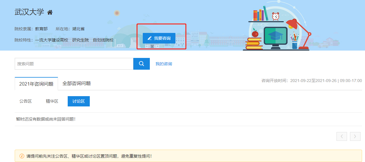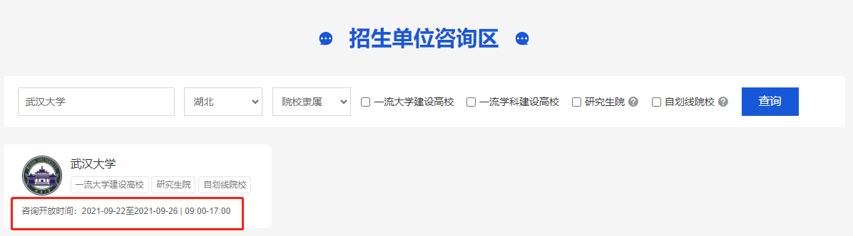 紅框內有標注咨詢開放時間:2021-09-22至2021-09-26 | 09:00-17:00,目前是標注了該學校的論壇開放時間,在這段時間內大家可以在這個頁面提問。開放時間每個學校都不一定相同。