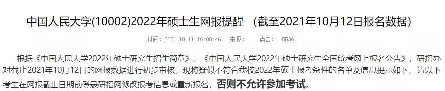 例如,中國(guó)人民大學(xué)研招辦近期發(fā)布《2022年碩士生網(wǎng)報(bào)提醒》,通知有部分考生報(bào)名不符合條件,考生如未在網(wǎng)報(bào)結(jié)束(10月25日22:00)前修改報(bào)考信息或重新報(bào)名,則不允許參加考試。