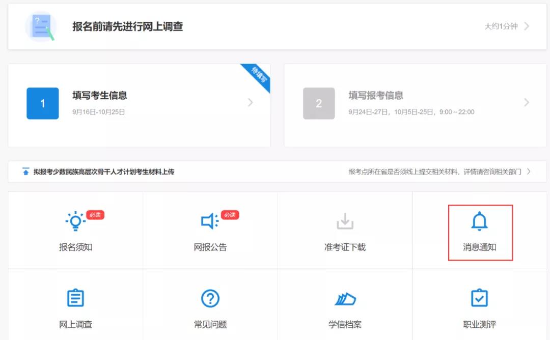 消息通知主要是報(bào)考點(diǎn)或招生單位發(fā)送的招考網(wǎng)報(bào)信息,考生登錄網(wǎng)報(bào)平臺(tái),查看消息通知即可!如果沒(méi)有收到消息,說(shuō)明報(bào)考點(diǎn)或招生單位沒(méi)有新的網(wǎng)報(bào)消息通知,考生不必驚慌。