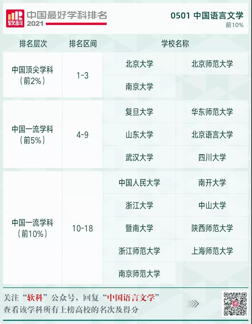中國(guó)語言文學(xué)學(xué)科排名前10%的高校: