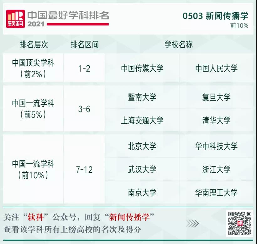 新聞傳播學(xué)學(xué)科排名前10%的高校: