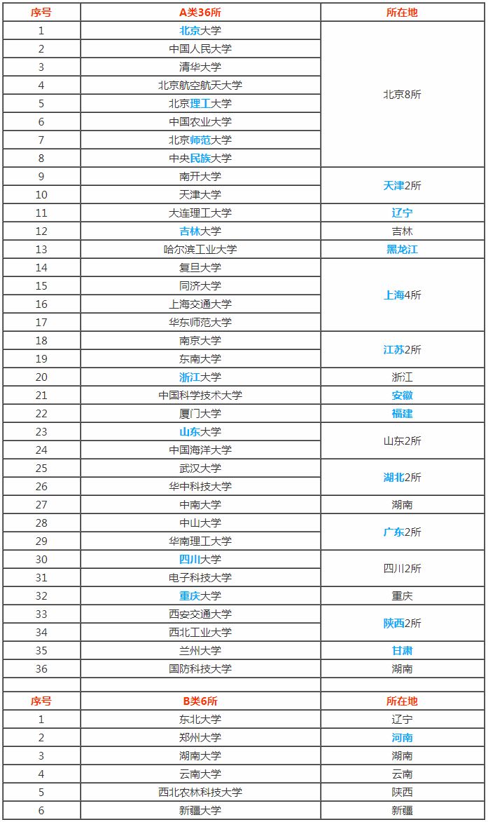 “雙一流”名單中,一流大學建設高校42所,其中A類36所,B類6所。