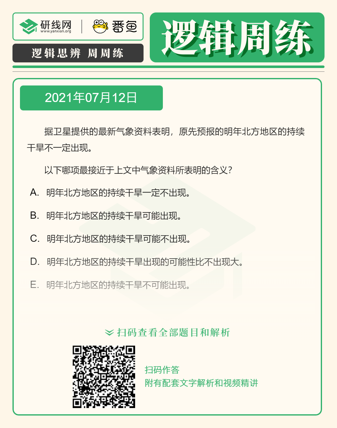 以上就是小編為大家整理“2022考研邏輯備考:7月12日邏輯專項(xiàng)練習(xí)及答案”的全部內(nèi)容,希望各位考生堅(jiān)持利用起來,想要獲取更多內(nèi)容請持續(xù)關(guān)注本網(wǎng)站。