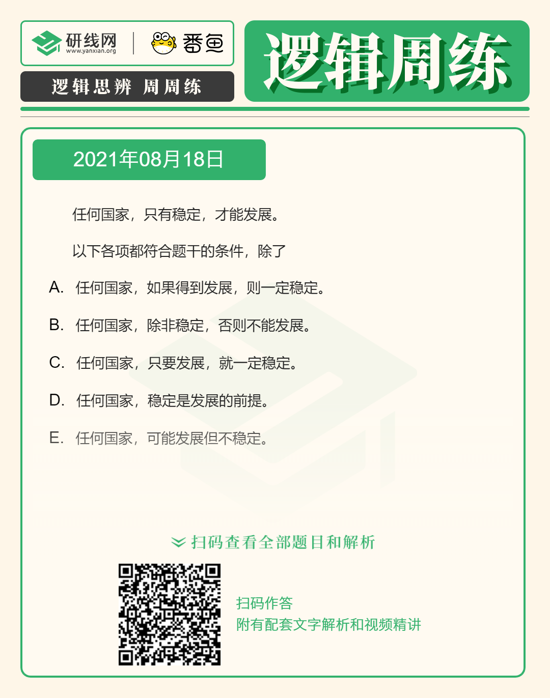 以上就是小編為大家整理“2022考研邏輯備考:8月18日邏輯專項練習(xí)及答案”的全部內(nèi)容,希望各位考生堅持利用起來,想要獲取更多內(nèi)容請持續(xù)關(guān)注本網(wǎng)站。