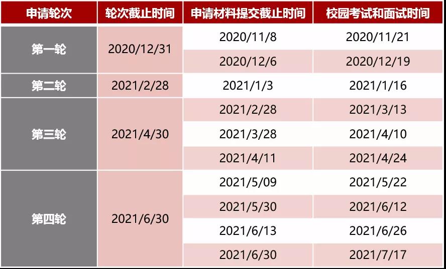 2) 條件錄取 準備或已預約參加GMAT/GRE/雅思/托福等標準化考試的申請人如通過審核資格,可以參加面試,通過面試后將收到“條件錄取”的結果。此類申請人須在2021年6月30日之前提交合格的考試成績以獲得正式錄取資格。