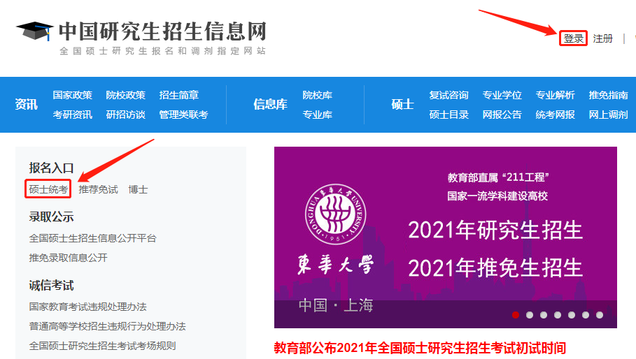 點擊中國研究生招生信息網(wǎng)首頁左側(cè)“碩士統(tǒng)考”、或者右上角“登錄”,進(jìn)入以下界面。
