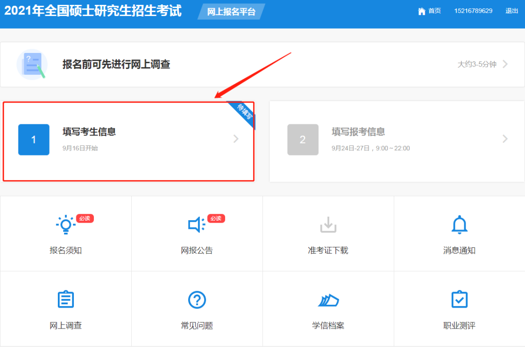 4.完成以上步驟后,可進(jìn)入網(wǎng)上報名平臺。網(wǎng)報系統(tǒng)將報名分為“填寫考生信息”和“填寫報考信息”2大步驟。