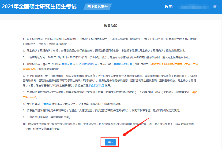 東華大學(xué)考點(代碼3110)網(wǎng)上確認(rèn)時間預(yù)計為:2020年11月5日至11月9日,具體要求10月下旬詳見《2021年碩士研究生招生考試(3110)東華大學(xué)報考點網(wǎng)上確認(rèn)公告》。