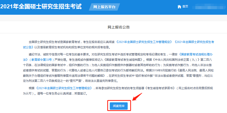 (2)閱讀網(wǎng)上報名公告,點擊“閱讀完畢”。