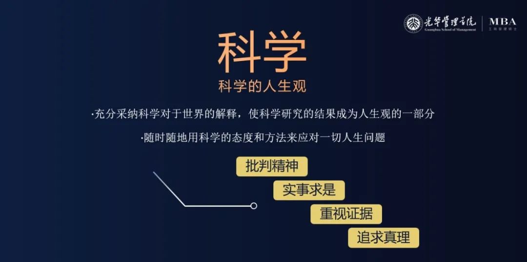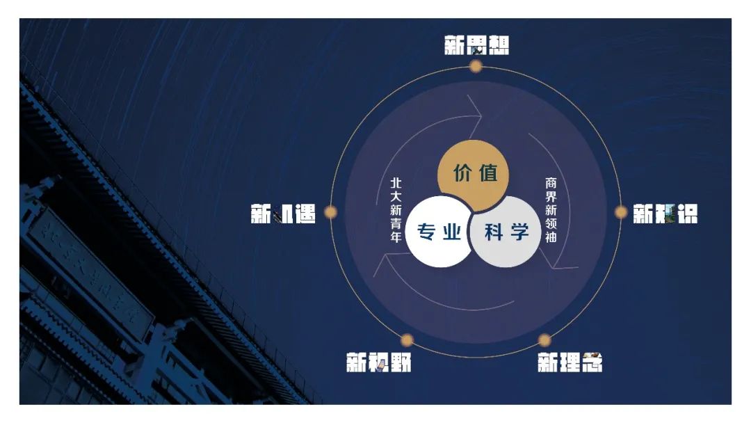 在科學方面,借助北大綜合學科優勢,項目開設了科學精神與素養相關課程。弘揚求真務實的科學精神,引導同學洞察未來科技變化趨勢,掌握科學方法論和工具;抓住北大推動新工科發展歷史機遇,促進新工科與經濟管理學科聯合培養體系的建設,重點建設金融科技、數字經濟、人工智能等前沿交叉學科;進一步打通課程體系,促進新工科和新商科人才混融交流,促進新技術的轉化,發展新的商業模式、推動傳統行業及企業的深刻變革;通過論文改革、MBAer研究所等原創新媒體欄目,提升管理人才的學術研究意識與能力,推動MBAer走出舒適區,擁抱新世界。