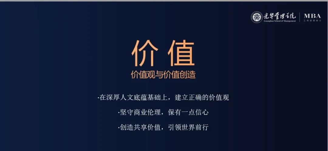 在價值方面,北大光華MBA項目以新時代的博雅教育以及價值的多元化和完全的人格培育為核心。北京大學深厚的人文底蘊為項目帶來了人文精神與人文素養、從歷史看管理等系列人文課程。企業社會責任等課程的設立,更是為了避免將學生培養成精致利己的單向度的人,使他們在未來不僅能夠取得商業上的成功,更能夠勇于承擔社會責任,推動社會進步。社會公益課程更是推動學生踐行 “以商助善”的公益理念,成為推動社會進步的中堅力量。