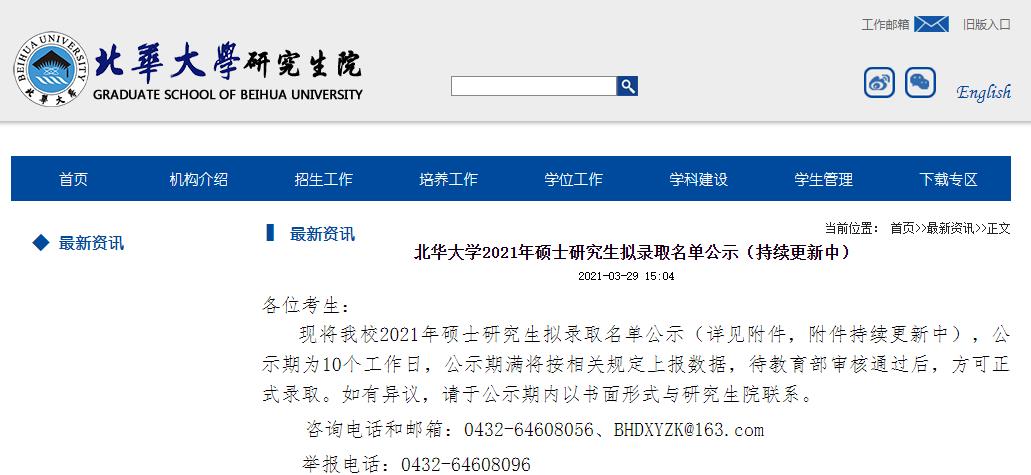 2021考研擬錄取名單:北華大學2021年碩士研究生擬錄取名單公示(持續更新中)