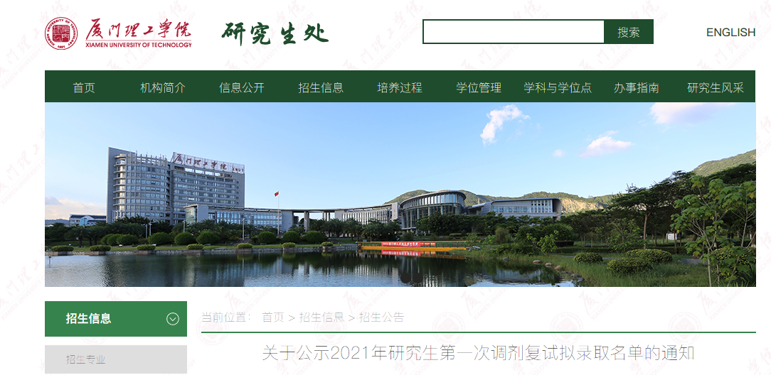 我校第一批調(diào)劑復(fù)試已于3月24日復(fù)試完畢。根據(jù)我校《廈門理工學(xué)院2021年碩士研究生招生復(fù)試錄取辦法》,現(xiàn)將第一次調(diào)劑復(fù)試擬錄取名單公示(詳見附件),公示期:3月25日-4月9日。如考生對(duì)名單有異議,請(qǐng)?jiān)诠酒趦?nèi)與我校研究生招生辦公室聯(lián)系。聯(lián)系電話:0592-6291727/6291820;郵箱:yjsb@xmut.edu.cn。