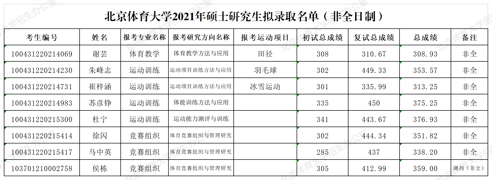 北京體育大學2021年碩士研究生擬錄取名單(非全日制)