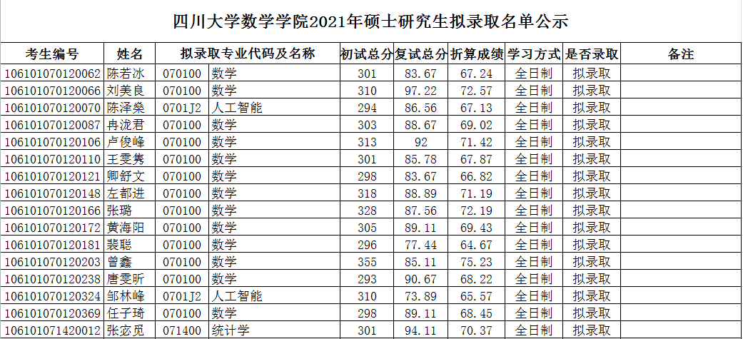 原文標題:四川大學數學學院2021年碩士研究生擬錄取名單公示