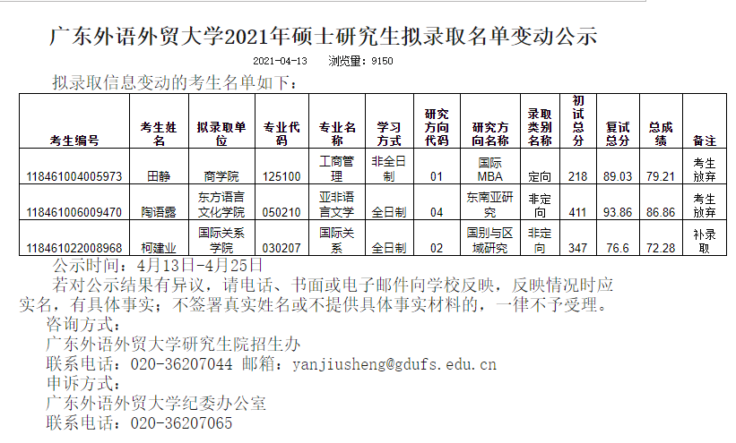 原文標(biāo)題:廣東外語外貿(mào)大學(xué)2021年碩士研究生擬錄取名單變動公示