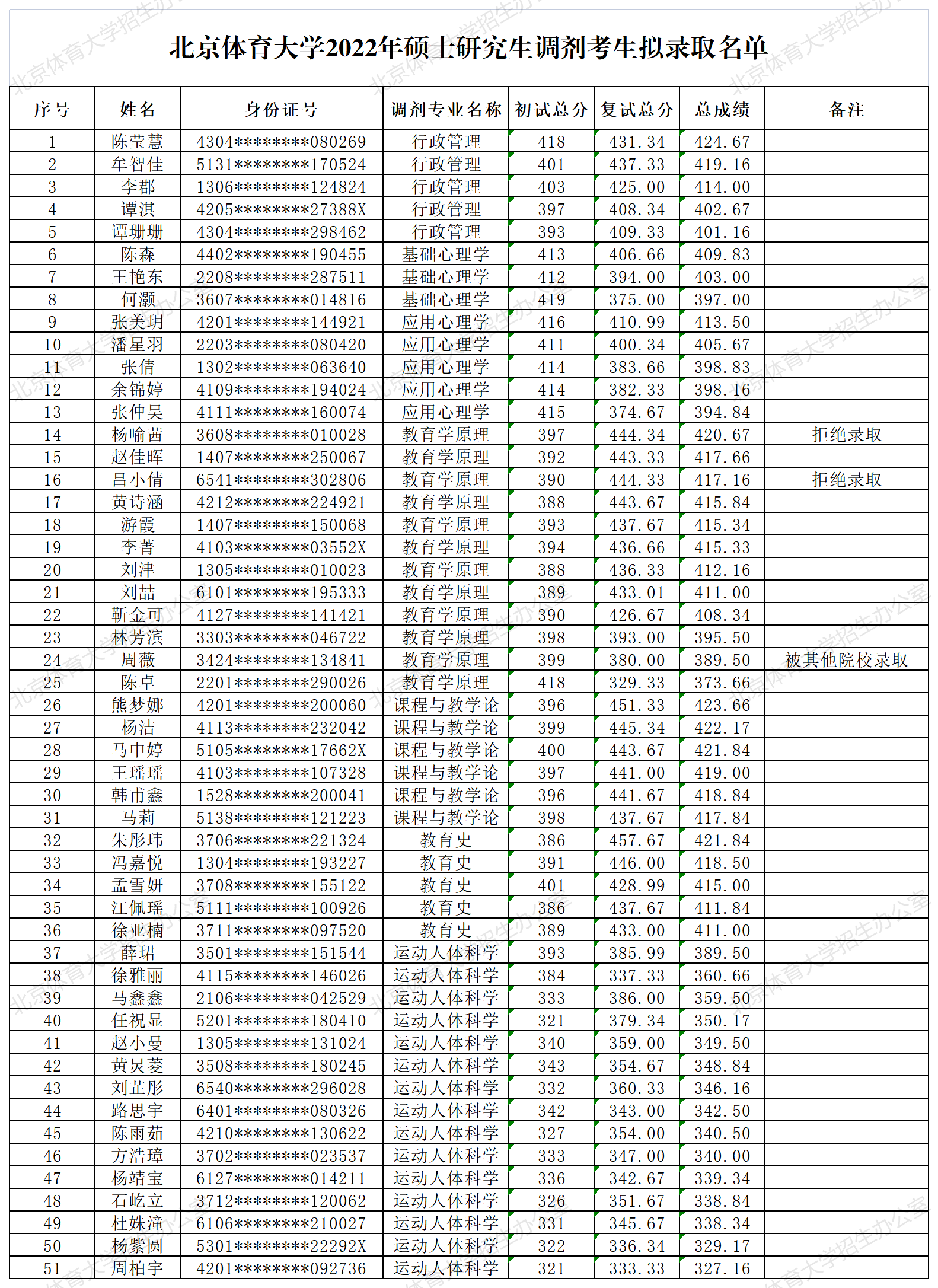 原文標題:北京體育大學2022年碩士研究生調劑考生擬錄取名單公示